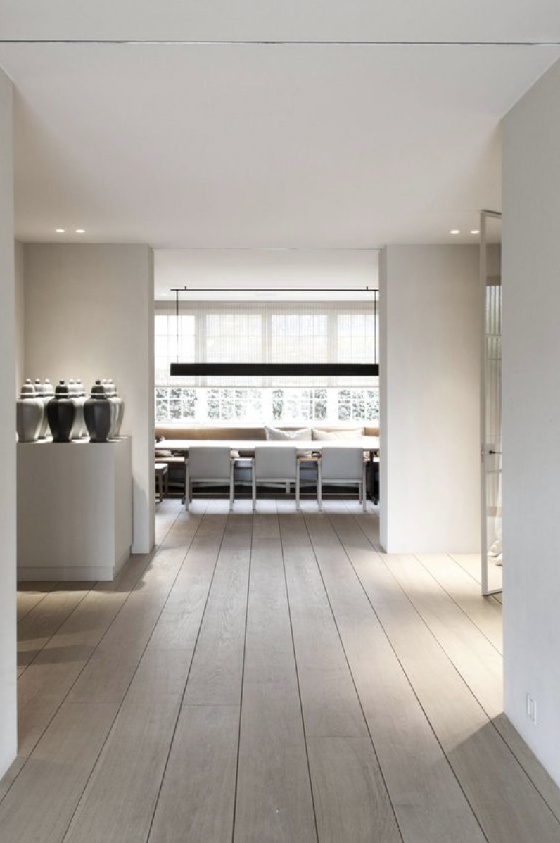 De plinten zorgen voor de afwerking van de vloer tegen de muur, maar tegelijkertijd ook voor de overgang van de vloer naar de muur. Daardoor spelen plinten ook een rol in het optische effect. Beter gezegd, de kleur van de plinten speelt een rol. Kies je voor plinten in de kleur van de muur of een andere kleur, dan zal de vloer kleiner worden. Kies je voor plinten in de kleur van de vloer, zal de vloer juist groter worden.